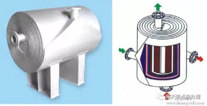 它的結(jié)構(gòu)是由兩張相互平行的鋼板卷成,形成通道,兩種介質(zhì)在各自通道內(nèi)逆向流動,它是一種高效換熱設(shè)備,使用汽-汽、汽-液、液-液之間換熱。由于該設(shè)備具有介質(zhì)流動通道寬(可達(dá)6~18mm)的特點(diǎn),適合于處理雜質(zhì)較多淬火介質(zhì),同時它也降低了對過濾器過濾效果的要求。它的傳熱系數(shù)高達(dá)3300(W/m2·℃)。略低于板式換熱器,是列管式換熱器的2~3倍。