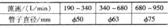 表4 為冷卻系統(tǒng)的管徑尺寸選擇推薦數(shù)據(jù)。管徑過小,將對流體運(yùn)動產(chǎn)生阻力,降低泵的工作效率。
