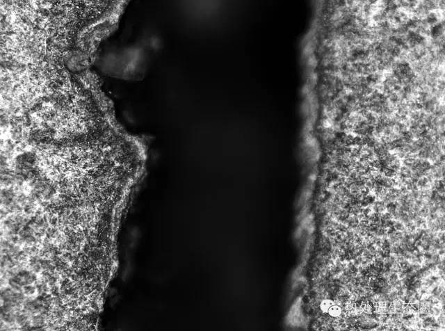 軸承零件在淬火冷卻過程中因內應力所形成的裂紋(見圖4)稱淬火裂紋。造成這種裂紋的原因有:軸承套圈淬火后內外徑或平面有細而且長的裂紋,用線切割機切開觀察裂紋處沒有明顯的脫碳如圖5所示。