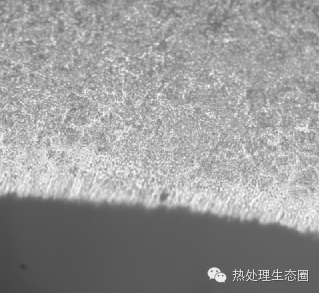 軸承套圈淬、回火拋光后發(fā)現表面有明顯的麻點,線切割后觀察縱斷面發(fā)現脫碳層深度遠遠超過標準的規(guī)定(見圖6)。其原因是套圈在淬火加熱過程中,淬火加熱爐內的碳勢低,經調查是由爐頂滴入甲醇的孔其中有一個被堵塞,導致滴入爐內甲醇量少所致。采取的措施為防止爐頂進氣管結碳,影響保護氣氛碳勢,要求操作工每班必須疏通1~2次。