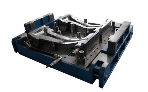 熱沖壓成形模具。在熱沖壓過程中鋼板和模具都要經(jīng)過從900℃以上到室溫這一復(fù)雜的溫度變化。模具集對板料成形與淬火作用于一身,其材料選擇、結(jié)構(gòu)設(shè)計(jì)都有嚴(yán)格的要求,對于熱沖壓部件最終性能有著重要影響。