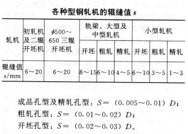 型鋼軋機輥縫值的大小取決于機架的構造、軋制力的大小、軋輥直徑大小以及孔型的用途。對于壓下量很小的成品孔型和其他精軋孔型應盡量選取小的輥縫值,以獲得幾何形狀正確和尺寸精確的產品;對于開坯孔型和延伸孔型,輥縫值的大小對產品形狀的正確性和尺寸精確性影響不大,所以輥縫值可適當增大,以減少孔型切入軋輥的深度,增加軋輥重車系數和提高軋輥的使用壽命,同時也有利于采用調整輥縫值的辦法在同一個孔型中獲得各種高度尺寸的軋件,從而擴大孔型的共用性,減少換輥次數,提高軋機作業率。但是,輥縫值過大時,軋槽過淺,起不到限制金屬橫向流動的作用。輥縫值s一般根據表中所列經驗數據選取。輥縫值有時也根據軋輥直徑D按下述經驗關系式確定: