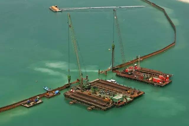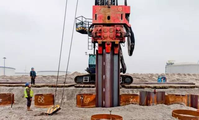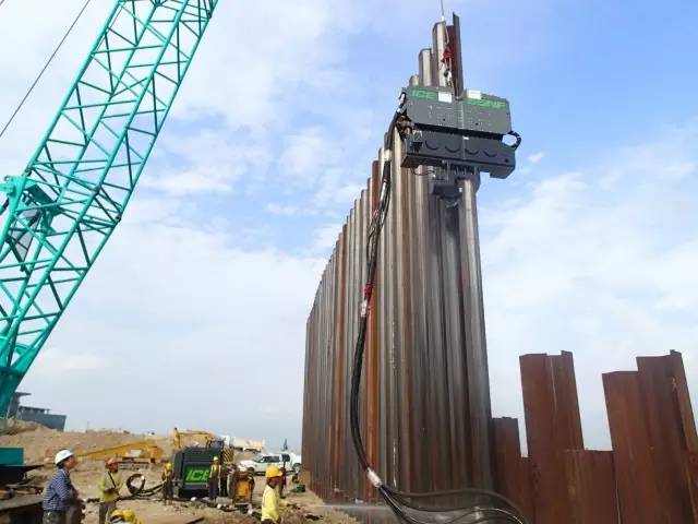 河里的防水圍堰。通常選用更寬點的6號樁。鎖口鋼板樁的長度在15到24米之間,由416L型液壓振動錘驅打。更復雜的可能含有礫石的土壤,可以選擇中等大小的錘,如815C。圍堰能為混凝土基礎的修建提供干燥的碼頭。橋塔建成之后,鋼板樁會被取出重新利用。需要避免使用泥漿和隔水墻的深基礎。有時候鋼板樁會與護筒樁配合使用,以獲得更大的側向承載力。這些應用需要AZ 型鋼板樁,長度為24 -36米。對于挖掘深度達到20米的情況,這些寬的鋼板樁很經濟,能提供很大的側向承載力。中等大小的815C或更大的1412C常被選來完成這些環保建設項目。