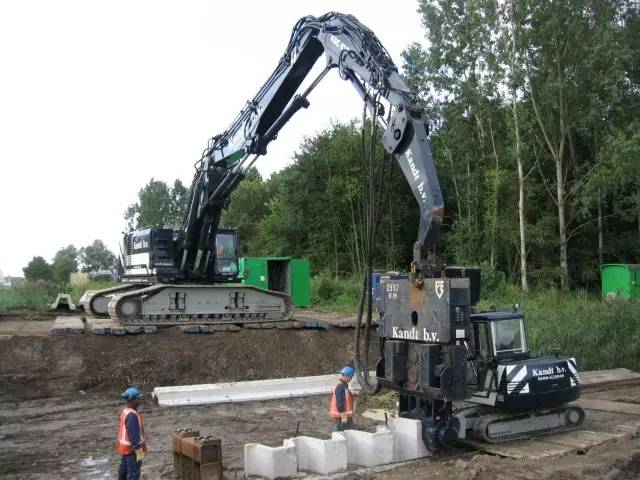 修建地下城市綜合管廊時的挖掘工作由鋼板樁墻來保護。免共振液壓錘允許您在現有建筑旁施工,不會因噪聲而擾民,亦不會因低頻振動破壞建筑。AZ型鋼板樁也可用于鐵路、高速路立交橋和車庫的永久荷載支撐結構。能獲得好的土壤保持和好的承載力兩大功能。中等的815C和更大的1412C錘常常被選用做這些建設項目。混凝土板樁!在河和航道岸邊,混凝土板樁成本較低、養眼。標準強度的混凝土樁可以用液壓振動錘來打,較薄的混凝土板樁很容易因共振而受損,必須采用免共振液壓錘。
