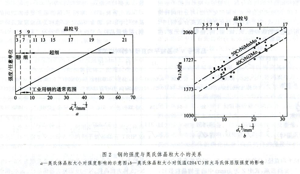 可以看出,隨晶粒細化值增大),鋼的強度線性增高。直線的斜率即上式中的Kg值。常溫及低溫下晶粒細化之所以提高鋼的強度,是因為晶界阻礙位錯運動的結果。在這個意義上,也可把晶粒細化強化稱為晶界強化。當把晶粒進一步超細化以后,可使鋼的強度大幅度升高。通過形變熱處理,在近于鋼的臨界點Ac3的溫度強烈形變,恒溫或慢冷一段時間使形變奧氏體再結晶,然后快速冷卻阻止再結晶的晶粒長大;或者通過快速反復奧氏體化和淬火的方法(反復次數的多少視鋼種而定),均可獲得超細奧氏體晶粒(晶粒號大于13)。這樣超細的奧氏體晶粒可使鋼的強度顯著升高,如圖2所示。