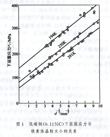 這一對應關系是由Z=2(N+3)變換而來,式中Z為lmm2中的平均晶粒數目,N為晶粒號。由此可得每一晶粒平均所占的面積(截面)及每一晶粒的平均直徑。一般工業用鋼中,晶粒號通常表示的是奧氏體的晶粒大小,也可特指鐵素體的晶粒大小。例如,以鐵素體為基體的工程結構鋼可特指鐵素體的晶粒大小;淬火回火鋼則指淬火前奧氏體的晶粒大小。工業用鋼細晶粒號的通常范圍為N5~10,N%26lt;5稱為粗晶粒,N%26gt;10則稱為超細晶粒。霍爾一佩奇關系式可描述鋼的屈服強度和晶粒尺寸的關系:%26sigma;y=%26sigma;0+Kgd-n4. 式中%26sigma;y為鋼的屈服強度;%26sigma;0為常數,大體相當于單晶鐵的屈服強度,與溫度、成分有密切關系;Kg為表征晶界對強度影響程度的常數,與晶界結構有關,而與溫度關系不大;d為晶粒大小,可以是鐵素體晶粒大小、奧氏體晶粒大小,也可以是亞晶的大小;指數n4=0.5。例如O.11%碳鋼的下屈服應力與鐵素體晶粒大小的關系如圖1所示。