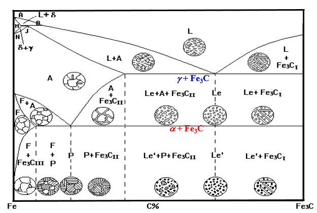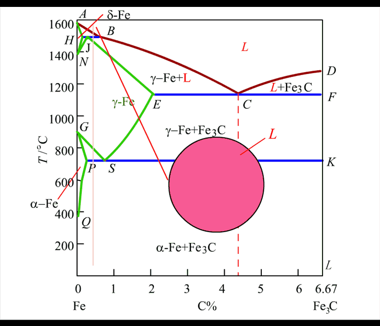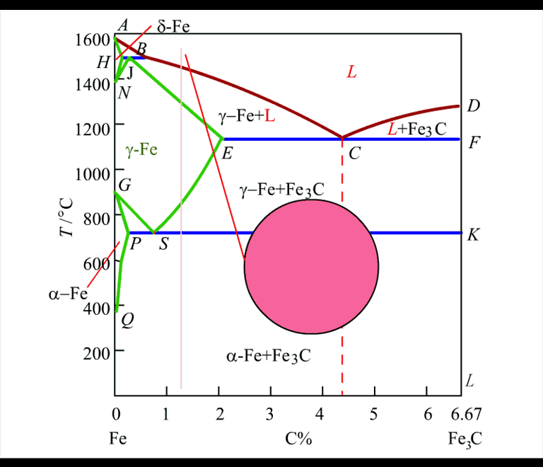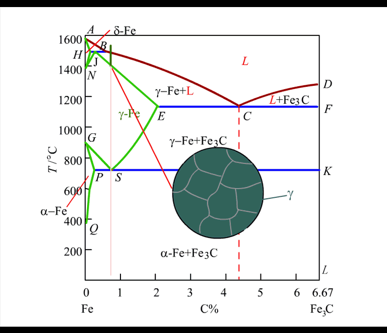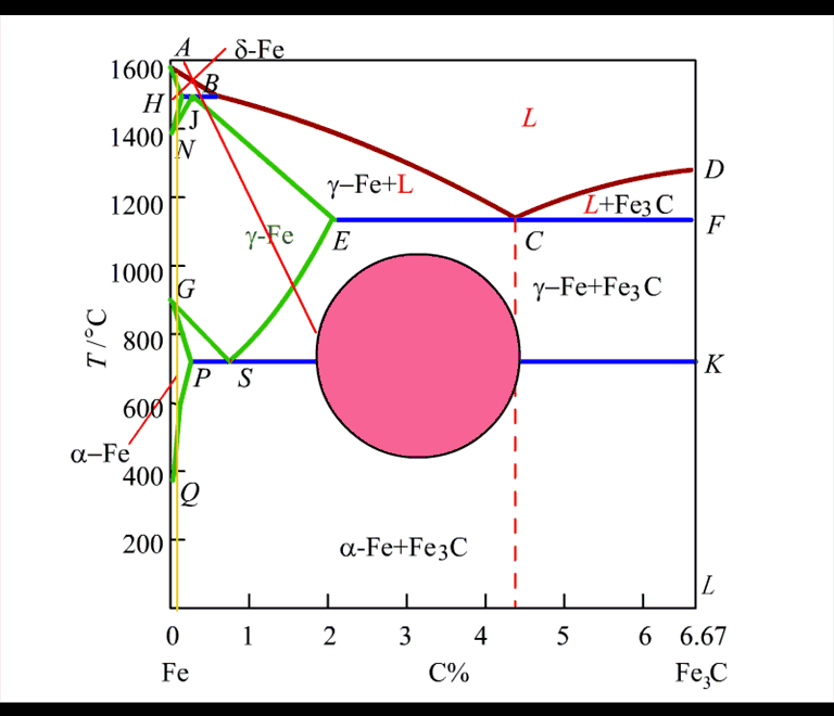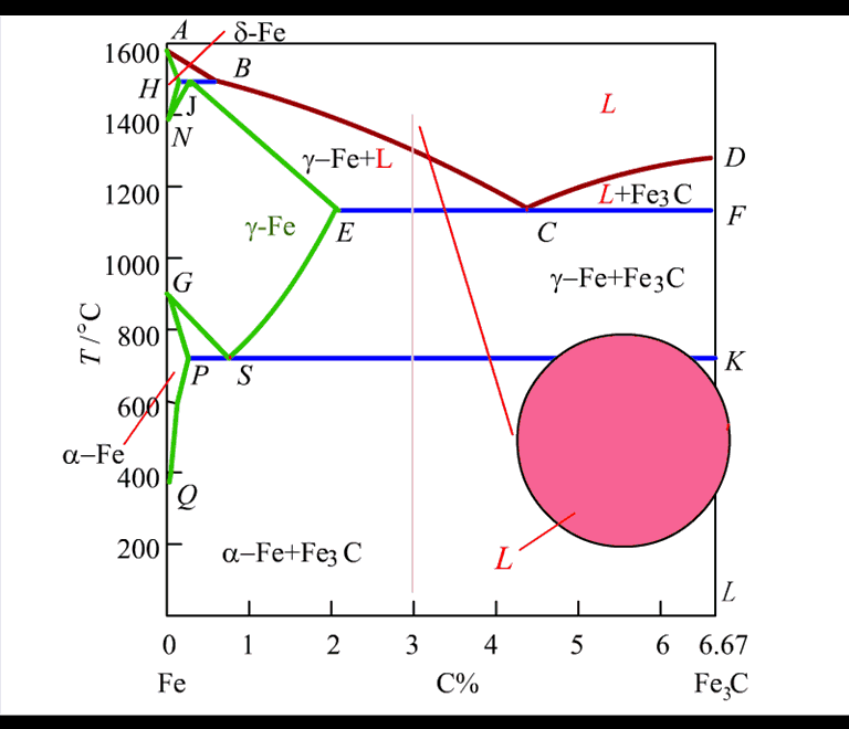鐵碳相圖中的相有: 鐵素體:碳溶解于α-Fe中形成的固溶體,用α 或 F 表示; 高溫鐵素體(δ-鐵素體) :由于δ-Fe是高溫相,因此碳溶解于δ-Fe中形成的固溶體也稱為高溫鐵素體,用δ 表示 奧氏體:碳溶解于g-Fe中形成的固溶體,用g 或A 表示 滲碳體:鐵和碳形成的化合物,含碳量為6.69%,用Fe3C或Cm表示 鐵碳相圖中的組織: 珠光體:共析轉變的產物,是a 與Fe3C的機械混合物,用P表示。 萊氏體:共晶轉變的產物是奧氏體與滲碳體的機械混合物,用符號Ld 表示。 低溫萊氏體:這種由P與Fe3C組成的共晶體稱,用Le’表示 此外還有Fe3CⅠ、Fe3C Ⅱ、Fe3CⅢ以及Fe3C(共析滲碳體) 是不是已經凌亂了,不要急,看了圖就不亂了 組織及相組成計算 接下來讓我們們看一下含碳量不同的液相的析晶過程: C%很低 共析 過共析 亞共晶 共晶 過共晶