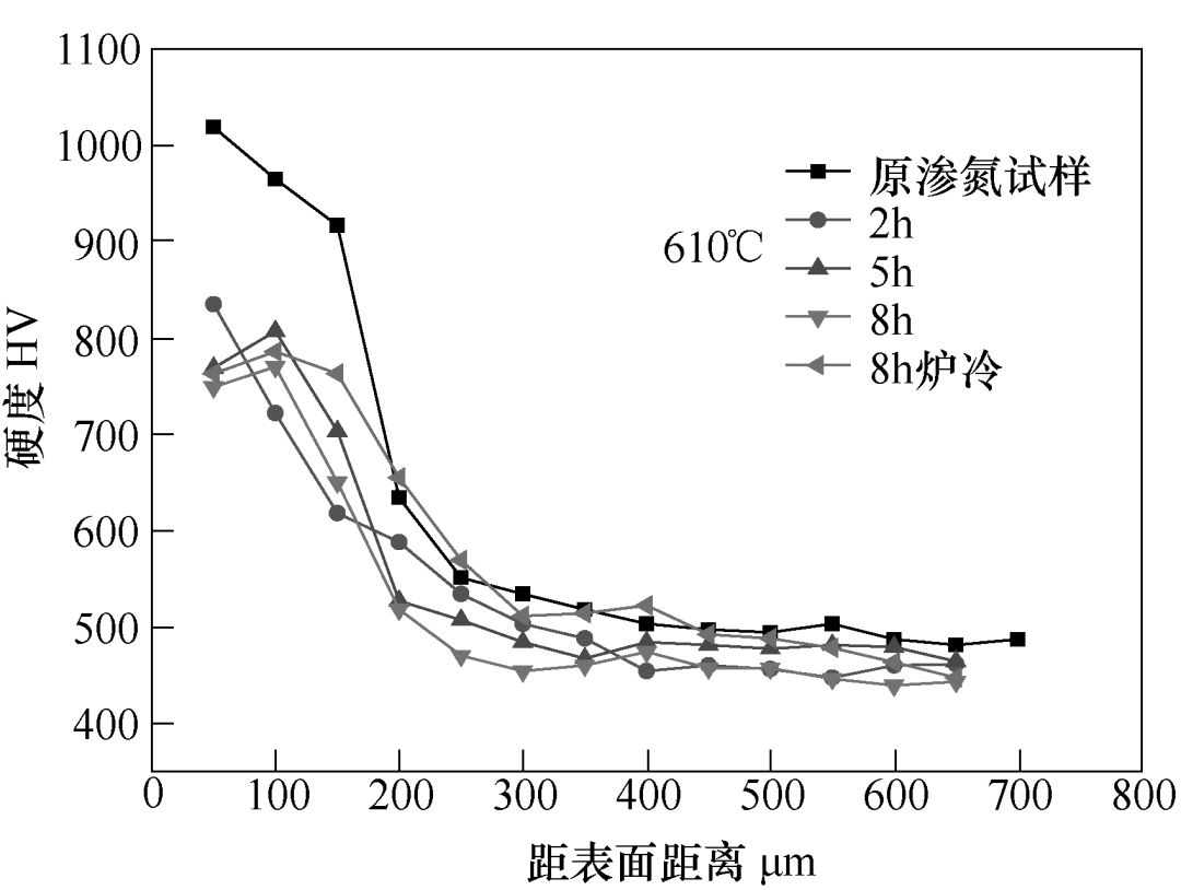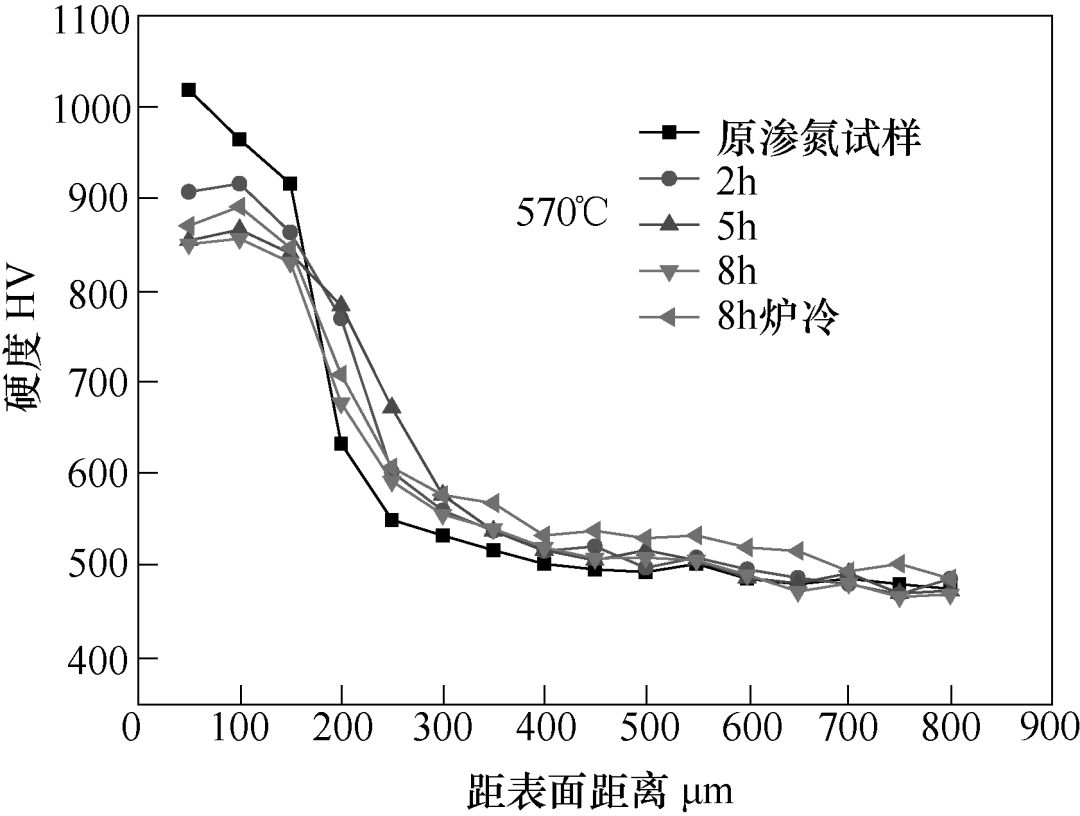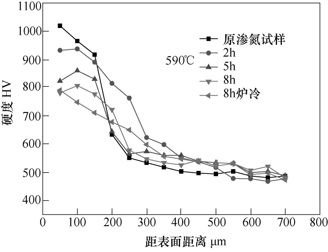 圖2是不同溫度在不同時(shí)間下滲層的硬度梯度分布圖。從梯度的變化可以看出,退氮處理后試樣表層硬度下降明顯,相比原始滲氮試樣,滲氮層的硬度梯度更加平緩,滲層厚度有所增加。