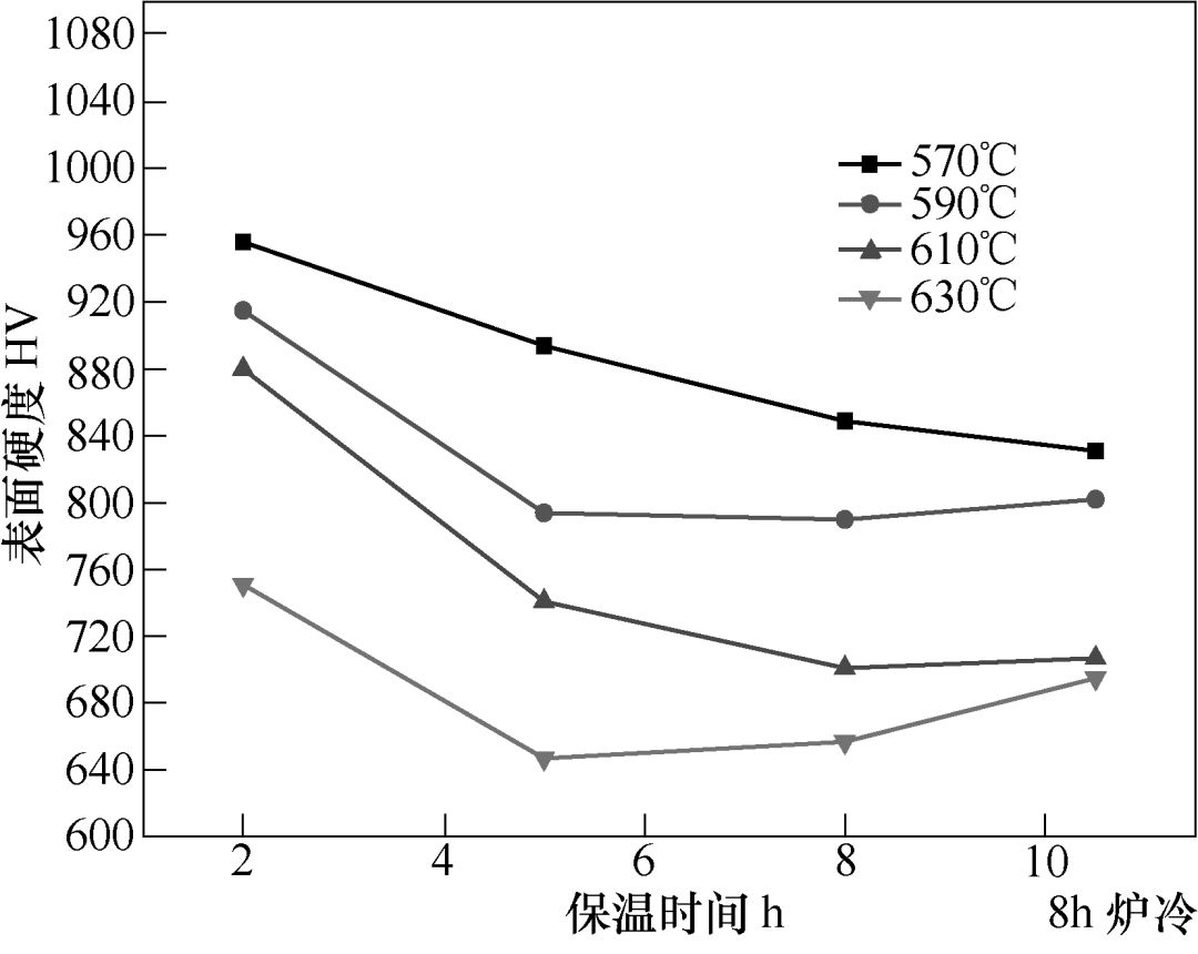 圖1為不同溫度和時(shí)間下退氮處理后表面硬度對(duì)比。可以看出,在高于570℃的溫度退氮處理后表面硬度均有不同程度的下降;溫度越高,硬度下降越多;隨時(shí)間增加,硬度從2~5h硬度下降明顯,5h以后硬度變化趨小;溫度的影響要比時(shí)間大,630℃×2h處理的效果比570℃×8h效果更顯著。另外,可以看出保溫8h空冷和爐冷試樣表面硬度相差不大,說(shuō)明冷卻方式對(duì)退氮后表面硬度影響不大。