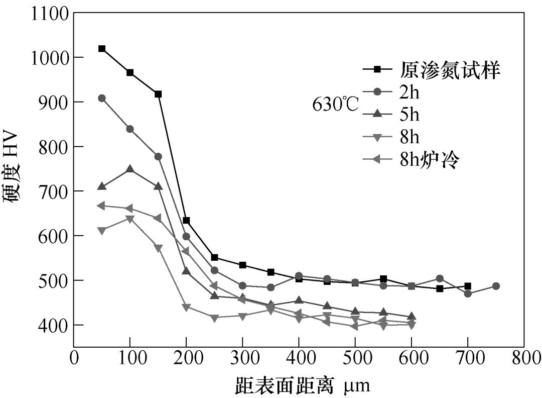 對(duì)于570℃和590℃處理的試樣,從離表面距離0.25mm向里,其硬度的下降有所緩和,并超過(guò)了處理前滲氮的硬度值。退氮不僅使氮原子向外擴(kuò)散,而且伴隨著向內(nèi)擴(kuò)散,表層硬度下降的同時(shí),滲層內(nèi)部硬度增加。對(duì)于610℃和630℃,滲氮層0.25mm以后的硬度都低于了原滲氮試樣,雖然氮原子向內(nèi)擴(kuò)散,但由于加熱溫度高于試樣回火溫度,使基體軟化,導(dǎo)致滲層硬度下降。