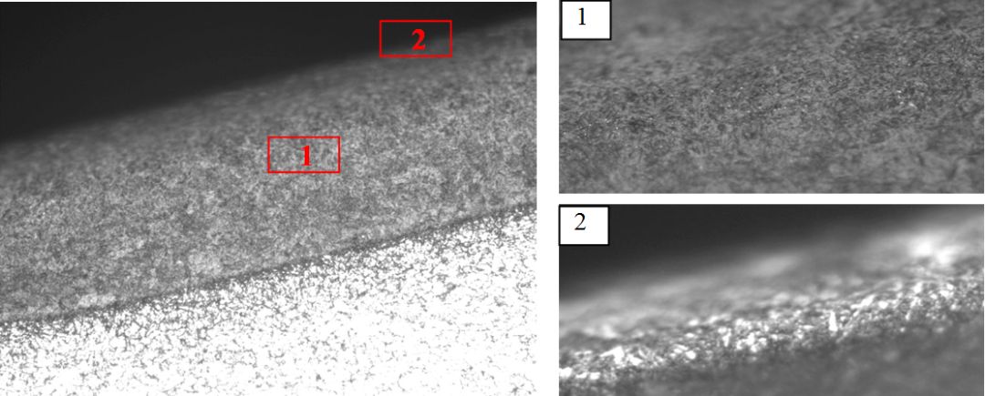 圖3為退氮后滲氮層金相組織。可見擴(kuò)散層和基體組織間有一條明顯的過(guò)渡層。對(duì)滲層部位1在500倍下觀察可已看出擴(kuò)散層的脈狀氮化物均已擴(kuò)散分解成粒狀。由于在箱式爐中退氮,滲層表面有明顯的脫氮氧化現(xiàn)象(見部位2)。