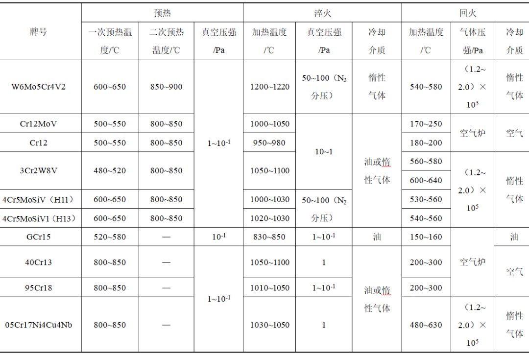 1)加熱溫度。真空淬火的加熱溫度一般取鹽浴爐和空氣爐的下限。真空回火、真空退火、真空固溶處理及真空時效的加熱溫度一般與常規(guī)熱處理時的加熱溫度相同。