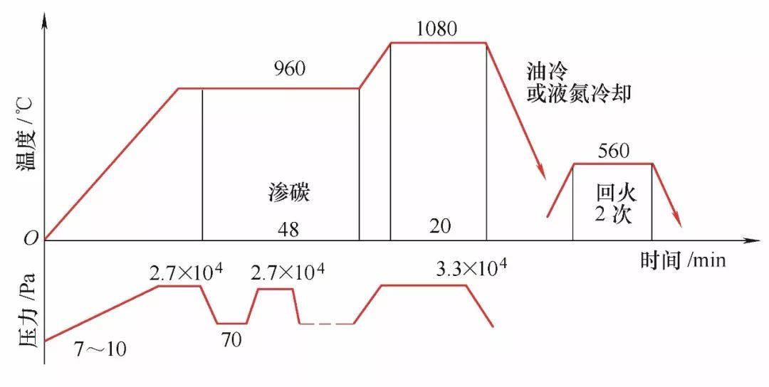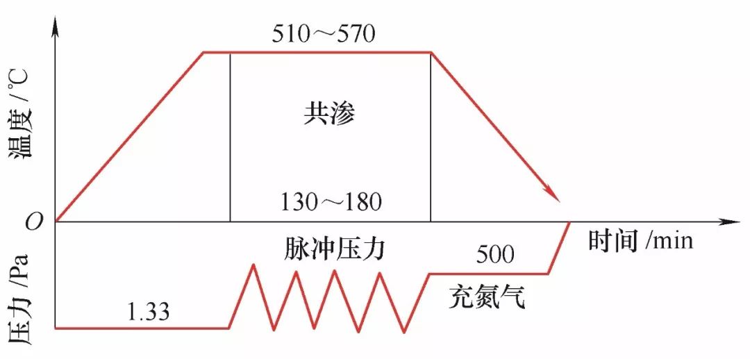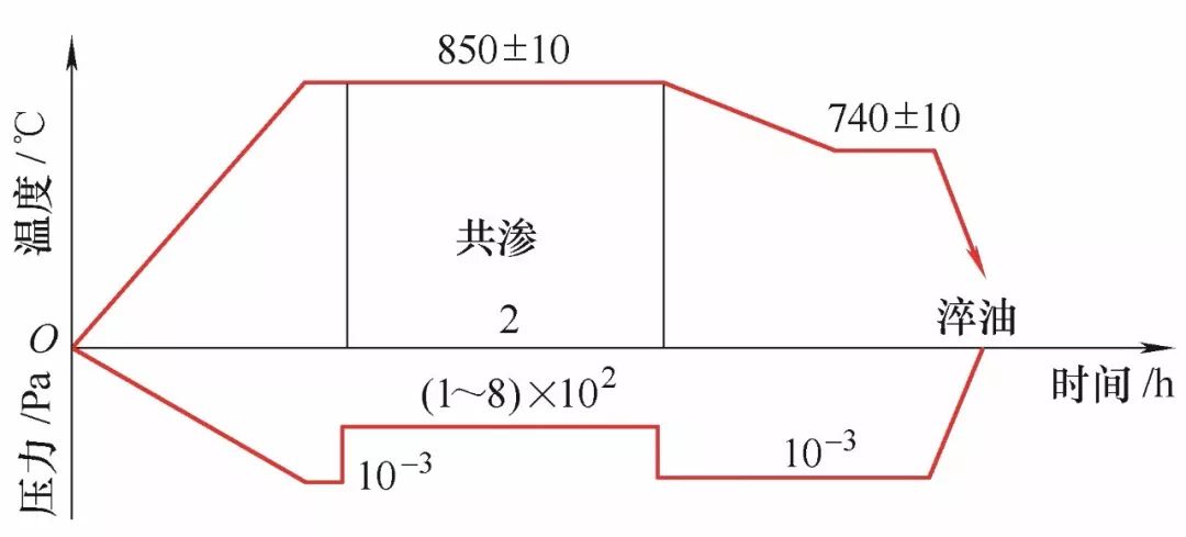 2)真空脈沖氮碳共滲工藝:共滲劑成分(體積分數(shù)):50%丙烷+50%氨氣,其工藝曲線見圖6。