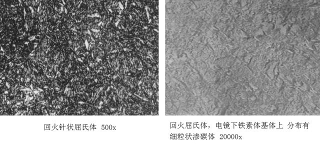 特征:它由馬氏體在350~500℃時中溫回火形成。其組織特征是鐵素體基體內分布著極細小的粒狀碳化物,針狀形態已逐漸消失,但仍隱約可見,碳化物在光學顯微鏡下不能分辨,僅觀察到暗黑的組織,在電鏡下才能清晰分辨兩相,可看出碳化物顆粒已明顯長大