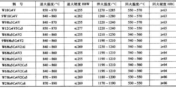 常用高速鋼的退火溫度和退火以后的硬度見表1 。