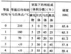 從減少淬火畸變和防止開裂的角度來說,等溫淬火更為有利。要進行等溫淬火的高速鋼工件,應先在分級鹽浴中冷卻,然后再到貝氏體區域做等溫停留。通常是在240℃~260℃等溫60~240min。表5列出了等溫時間對W18Cr4V高速鋼組織和硬度的影響。