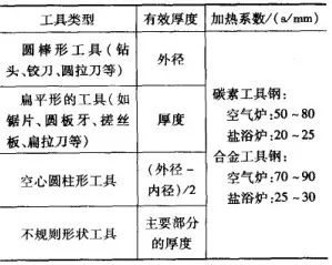 高速鋼的淬火加熱時間通常以工件的有效厚度乘以加熱系數來計算,有效厚度參照表4 。