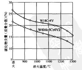 隨著加熱溫度的升高,碳化物不斷溶入高速鋼基體,高速鋼中的殘留碳化物數量不斷減少。圖2顯示了W18Cr4V和W6Mo5Cr4V2兩種高速鋼在淬火加熱時碳化物數量逐漸減少的情況。