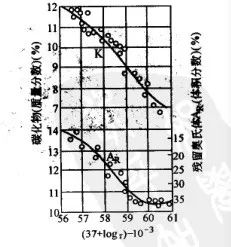 公式中淬火參量P,代表了淬火加熱溫度和加熱時間的綜合作用。在淬火過程中,無論淬火加熱溫度和保溫時間怎樣變化,只要兩者的作用結果和淬火參量相同,那么奧氏體化的程度就是相同的。圖4表示淬火參量、碳化物量和殘留奧氏體量的關系。
