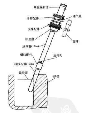 它是在輻射高溫計的下面,接一個封閉的延長管,并把延長管插入鹽浴內部。在工作時,向管內通壓縮空氣,還可以吹走管頂端的煙霧。這樣就測到了鹽浴內部的溫度,并克服了煙霧對測量準確性的影響。