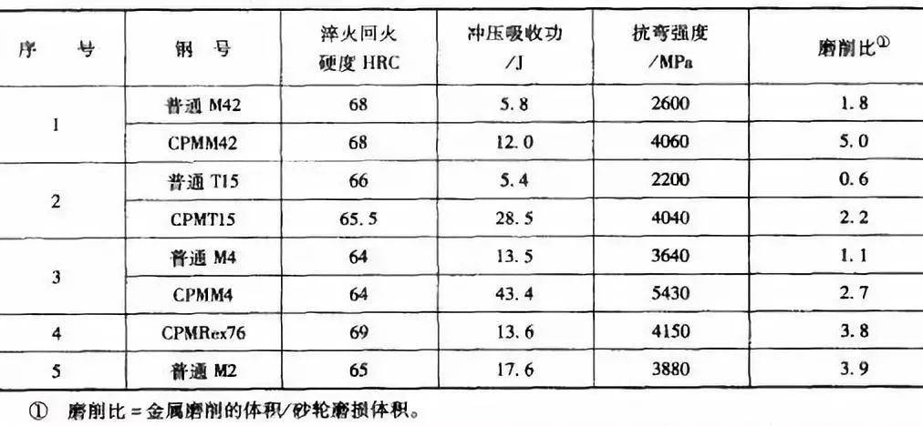 首先是改善材料的可磨削性,對大部分粉末高速鋼來說,可以比普通高速鋼成倍地提高可磨削性。由表6可見,CPMM42、CPMT15、CPMM4三個牌號粉末冶金高速鋼的磨削比,分別比普通高速鋼的磨削比提高2.8、3.7、2.5倍。