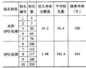 這種方法不僅大幅度提高工具的使用壽命,而且可以大幅度降低工具使用壽命的分散度,提高工具壽命的穩定性。表10是對一盒10支鉆頭,取5支不作QPQ處理,另外5支作了QPQ處理后的壽命對比數據。