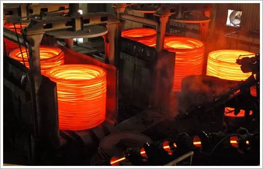 火紅的成品會在這里被工人們進行質(zhì)量初檢,然后到達吐絲機吐絲,成品線材在這里被盤成圓卷,冷卻后打包。