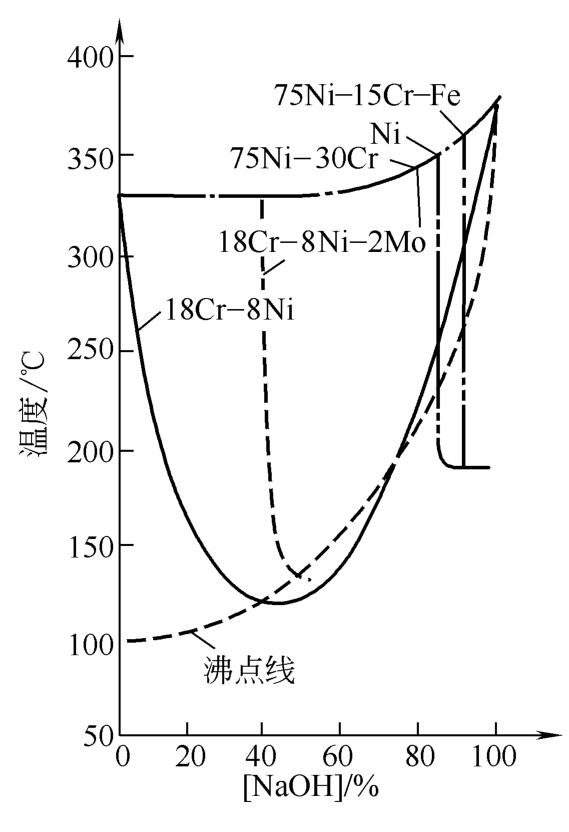 圖6 產(chǎn)生應(yīng)力腐蝕破裂的燒堿濃度與溫度關(guān)系