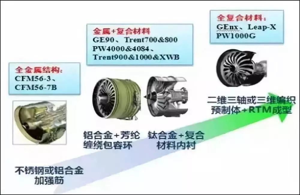 風(fēng)扇機(jī)匣是航空發(fā)動機(jī)最大的靜止部件,它的減重將會直接影響航空發(fā)動機(jī)的推重比與效率。因此,國外先進(jìn)航空發(fā)動機(jī)OEM也一直致力于風(fēng)扇機(jī)匣的減重與結(jié)構(gòu)優(yōu)化工作。如圖所示為國外先進(jìn)航空發(fā)動機(jī)風(fēng)扇機(jī)匣發(fā)展趨勢。
