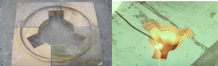 (1)爐膛型磚由于考慮到砌爐工人的勞動(dòng)強(qiáng)度大的因素,原來結(jié)構(gòu)采用的是組合式結(jié)構(gòu),強(qiáng)度較差,有以下弊病:縫隙較多,易滲鹽;拉刀爐實(shí)際使用中熱脹冷縮時(shí),型磚容易從組合相接處開裂。原組合好的型磚如圖2所示。