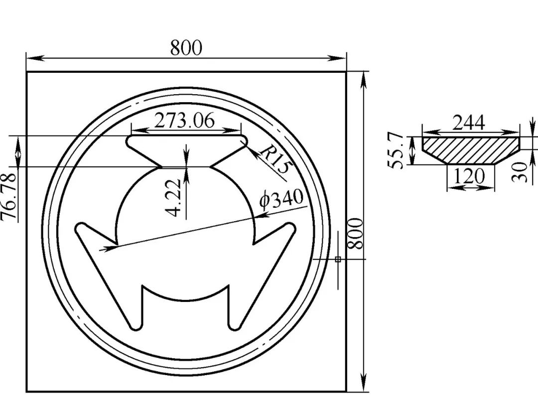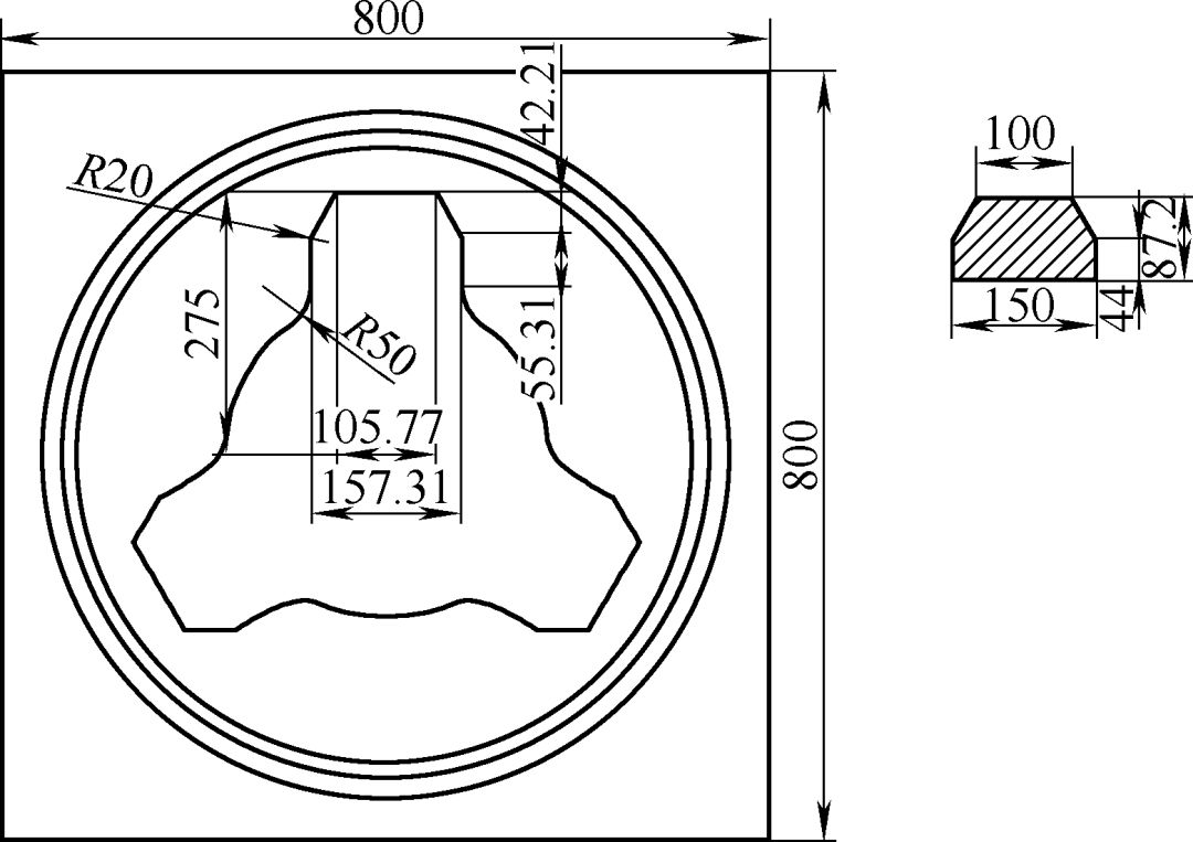 (3)原電極的長(zhǎng)方形截面抗變形強(qiáng)度低,主電極在熱處理的過程中易變形,圖3所示為組合后的型磚結(jié)構(gòu),圖3剖線部分為電極截面形狀。