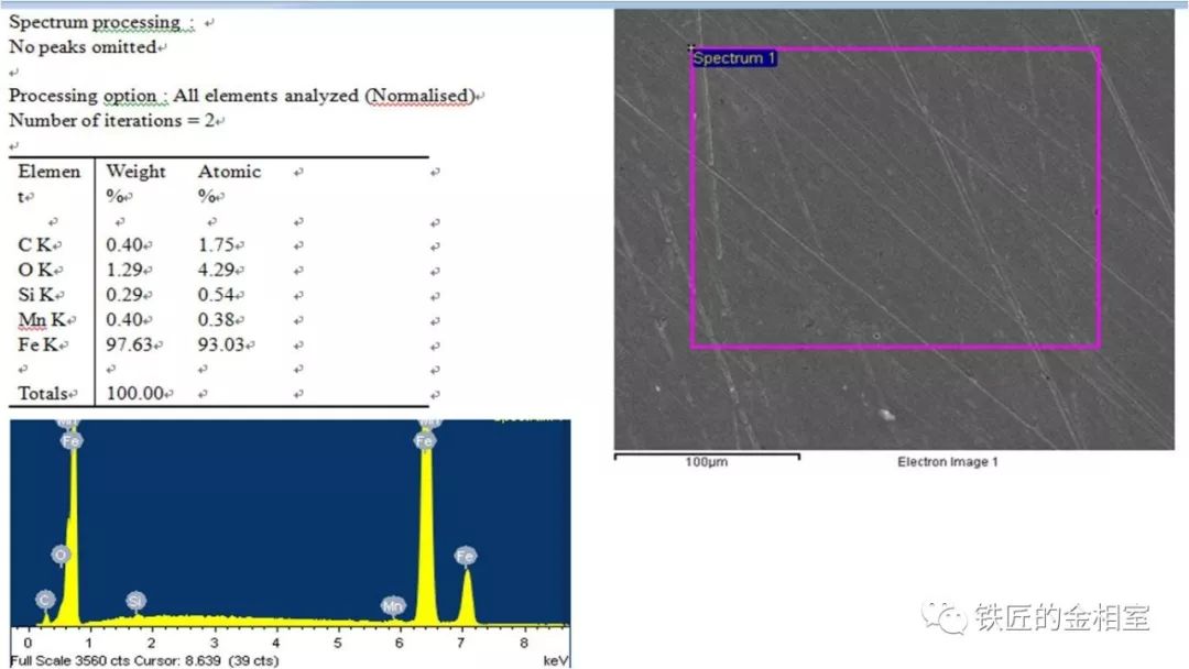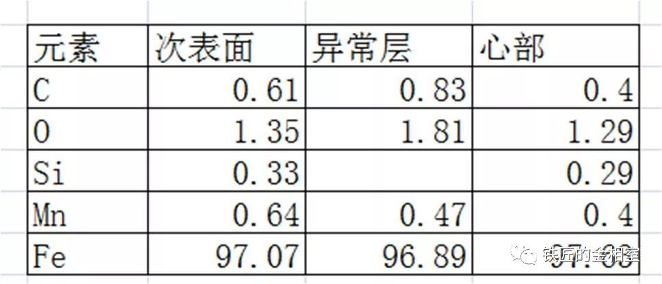 于是小徒弟去找大何了,和大何兩個在電鏡下搗鼓了半天,拿著EDS的檢測數據回來找師傅看,表層異常組織檢測結果 :