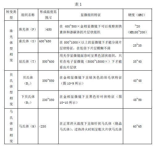 共析鋼過冷奧氏體在不同溫度等溫轉變的組織及性能列于表1中。