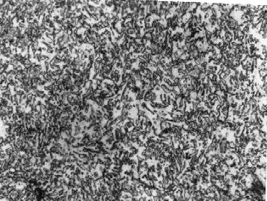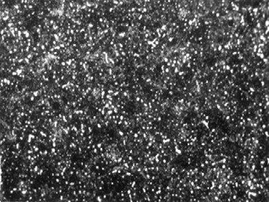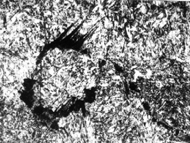 (5)殘余奧氏體(A殘) 是含碳量大于0.5%的奧氏體淬火時被保留到室溫不轉變的那部分奧氏體。它不易受硝酸酒精溶液的浸蝕,在顯微鏡下呈白亮色,分布在馬氏體之間,無固定形態。在圖8表示含碳1.2%的碳鋼正常淬火(780℃加熱),其組織為馬氏體+粒狀滲碳體+少量殘余奧氏體。