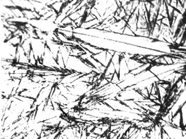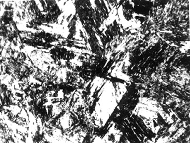 (4)馬氏體(M):是碳在a-Fe中的過飽和固溶體。馬氏體的形態按含碳量主要分兩種,即板條狀和針狀(如圖6、圖7所示)