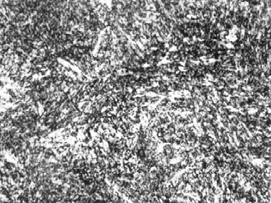 B、下貝氏體是在片狀鐵素體內部沉淀有碳化物的兩相混合物組織。它比淬火馬氏體易受浸蝕,在顯微鏡下呈黑色針狀(如圖5)。在電鏡下可以見到,在片狀鐵素體基體中分布有很細的碳化物片,它們大致與鐵素體片的長軸成55~60°的角度。