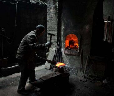 清,陳克恕《篆刻堿度》卷七”煉刀法”條說:“用酒蟹鉗嘴燒灰存性。仍用蟹酒調涂刀口,入火燒紅。復入蟹酒淬之。更涂鉗灰于上,如前燒紅淬酒。愈煉愈堅。依法煉畢,仍用火燒紅寸許,取懸火上,加昂出火外。漸漸退出,相其口上變色轉白未可亦淬,淬之則脆。既而轉黃轉青,淬之適中可用。太遲則火候過矣”。此“酒蟹嘴”為滲碳劑,“蟹酒”為催滲劑和淬火劑。整個工藝過程分為兩步:第一步是用反復加熱滲碳淬火來提高刃口硬度;第二步是回火處理,并根據回火色看回火的“適中”火候。