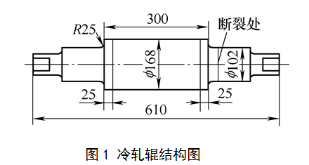 軋輥在φ102mm軸頸與R25mm過渡圓弧交接處附近發生斷裂而失效。據稱是在工作半個多小時后發生斷裂,前后有幾根軋輥裝機后均在同一部位工作幾小時到幾天之內接連發生斷裂,余下幾根不敢再裝機生產了。