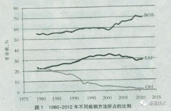 自此,氧氣轉爐煉鋼得到快速發展,而平爐煉鋼開始下降,如圖1所示。氧氣轉爐煉鋼發展超過平爐煉鋼的一個重要因素是連鑄技術的引進。連鑄要求鋼水源源不斷供應,而氧氣轉爐的工藝時間比較短,能很容易地滿足連鑄的鋼水供應,一個大轉爐(350t)的產鋼速度為500t/h。與此相對照,如果平爐常規操作,煉鋼至出鋼需要12—14h,或者如果借助工業用氧加速也需要7—8h。目前在烏克蘭、俄羅斯和印度仍然存在一定數量的平爐冶煉。這些爐子正逐步被電弧爐取代,2012年平爐工藝總產鋼量1690萬t,約占全球鋼產量的1.1%。