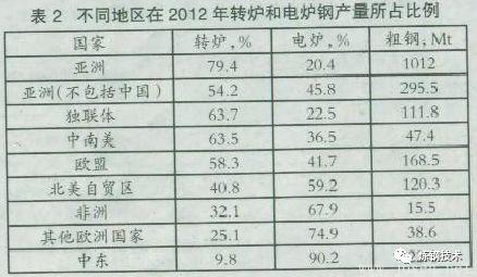 雖然電弧爐煉鋼產量沒有超過全球粗鋼總產量的三分之一(在2012年占29.3%),但由于中國在世界鋼產量的主導地位(占世界總量的46%),且它主要使用氧氣煉鋼,電弧爐煉鋼的影響被忽略,表2顯示了在2012年不同地區轉爐煉鋼及電弧爐煉鋼的相對比例。