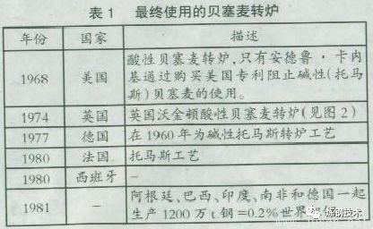 在世界的一些地區氧氣轉爐煉鋼和貝塞麥轉爐一直共存至1981年,但是在歐洲止于19世紀70年代,使用情況見表1。