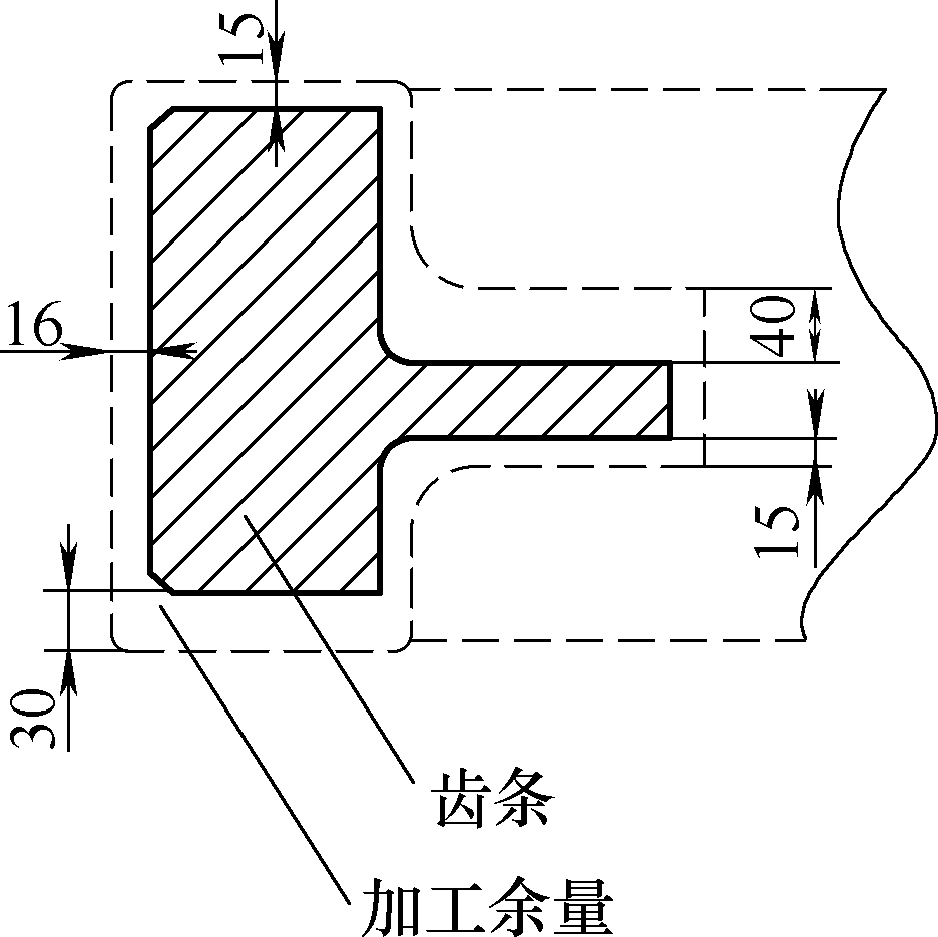 首先對齒條粗開齒后、熱處理前應(yīng)力釋放后導(dǎo)致的變形進(jìn)行檢測,根據(jù)變形情況選擇合適的加工余量。余量的選擇為:齒條采用粗開齒后進(jìn)行調(diào)質(zhì),齒側(cè)每面留8mm余量,齒底留有25mm余量,外圓每面留16mm,幅板上下端面分別留40mm、15mm余量,確保一旦發(fā)生變形后有足夠加工余量將變形量擬補(bǔ),為后續(xù)加工提供了保障,圖1為齒條加工余量示意。