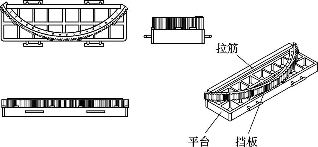 平臺上焊有6塊擋板,擋板采用Q235普通鋼板,規(guī)格為300mm×150mm×50mm,位置分布在沿齒條圓弧對稱焊接在平臺的橫梁上,齒條的弧頂兩側(cè),齒條弧長的1/3處,以及齒條兩端,限制了齒條外延及弓度的變形,有效的防止了齒條在淬火時出現(xiàn)竄動。