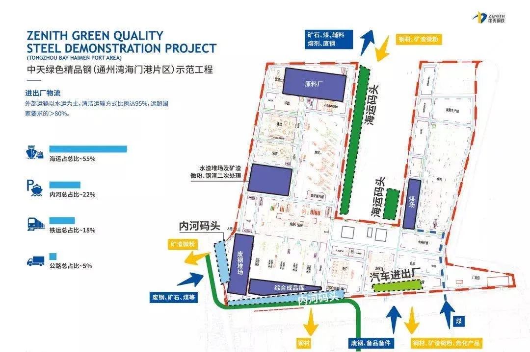 中天綠色精品鋼項目 位置 規模 定位 特點 集碼頭、煉焦、煤氣利用綜合發電機組、燒結、煉鐵、煉鋼、軋鋼為一體的全流程鋼鐵聯合企業 生產國內領先、國際一流的精品棒線材產品,項目配套建設大規模集控系統、智能制造控制平臺和自動化控制系統,全系統應用高端工業機器人,項目勞動生產率達到2000噸鋼/人·年以上 規劃 項目一次性規劃,分階段實施,一期項目產能規模800萬—1000萬噸,投資500億元,在完成項目備案審批的前提下,3年左右完成項目建設。 計劃分兩期實施,一期規劃810萬噸產能,一步按585萬噸產能建設,總投資約370億元,占地面積11600畝,同步建設循環經濟、鋼材深加工、裝配式鋼結構等多元產業基地。 進展 7月3日下午,寶武鹽城精品鋼基地建設工作對接會召開。據悉,項目可研已經全面啟動,專項規劃正在逐一完成,配套設施計劃年內開工建設,產能置換和項目備案有力推進,各項前期工作取得明顯進展。 6月9日,中天綠色精品鋼項目正式舉行EPC合作協議集中簽約儀式,標志著中天綠色精品鋼項目即將步入全面開工建設階段。
