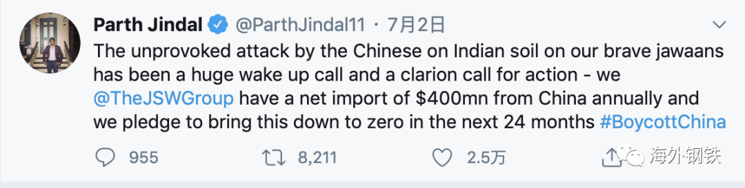 印度鋼鐵巨頭JSW Group的董事總經理Parth Jindal在7月2日發(fā)布推文稱,JSW將在未來兩年內將價值4億美元的中國進口額減少至零。ParthJindal11發(fā)推文:“中國對印度勇敢的無端攻擊(注:歪曲事實)是一個巨大的警鐘,并號召采取行動-我們@TheJSWGroup每年從中國凈進口4億美元,我們保證將這一目標在接下來的24個月內降為零”