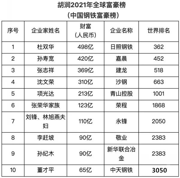 而杜雙華的日照鋼鐵平穩(wěn)得渡過了之前關(guān)停風(fēng)波,還在持續(xù)加碼新產(chǎn)能。日照鋼鐵集團(tuán)將在山東日照市嵐山區(qū)建設(shè)3000m高爐2座、300t轉(zhuǎn)爐2座,換算成產(chǎn)能為煉鐵產(chǎn)能500萬噸、煉鋼產(chǎn)能600萬噸,開工時間為2020年,擬投產(chǎn)時間為2022年。值得注意的是,山東省相關(guān)部門在官網(wǎng)披露60家擬入庫重點(diǎn)培育的“十強(qiáng)”產(chǎn)業(yè)集群領(lǐng)軍企業(yè)中,日照鋼鐵控股集團(tuán)有限公司為山東眾多實力強(qiáng)大的鋼鐵企業(yè)中的唯一入選者。渡盡劫波的鋼鐵首富,如今真的穩(wěn)穩(wěn)地歸來了。杜雙華一路走來,經(jīng)歷了種種的困難,但是他從來沒有害怕過,每一次面對困難,他都是迎難而上。8年前,杜雙華個人財富降至150億,2019年福布斯數(shù)據(jù)顯示其財富進(jìn)一步萎縮至76億人民幣,2020年,胡潤富豪榜顯示其財富又暴增回410億人民幣。今年,達(dá)到了500億。近20年間,杜雙華的財富起起伏伏,但其一手建立的商業(yè)帝國始終沒有隕落。財富、權(quán)勢扔進(jìn)進(jìn)擊的時代,會生出一種爆裂的擴(kuò)張性。杜雙華乘著這種東風(fēng)而起,也在市場溫平后漸漸蟄伏。他的人生路上有恢弘發(fā)跡、盛名之下的繁花,也有與妻子對簿公堂、為管理公司頭疼欲絕的荊刺,但當(dāng)站在當(dāng)下回望,那些都過往都成了暈染的點(diǎn)墨,濃墨重彩又無關(guān)緊要地修飾著他的人生。