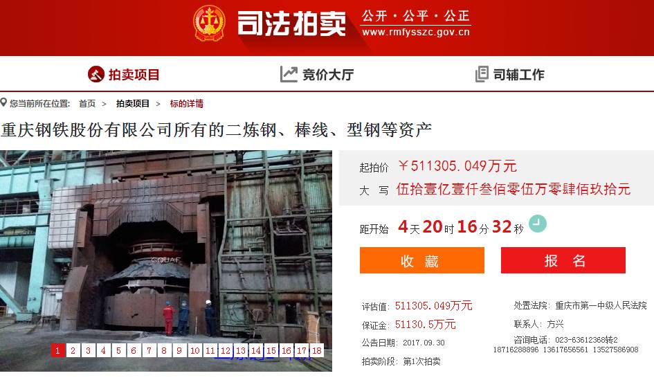 近日,人民法院訴訟資產網掛出重慶鋼鐵股份有限公司(下稱“重鋼”)的3項資產拍賣公告,將在2017年10月16日10:00至10月17日10:00(延時除外)對標的物按現(xiàn)狀依法進行公開整體拍賣,起拍價合計達到百億元的規(guī)模。
