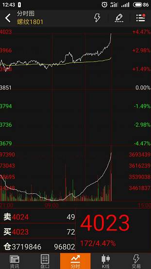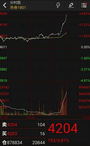 受此影響,期貨市場螺紋1801上午暴漲172點,漲幅4.47%,熱卷1801上漲193點,漲幅4.81%。