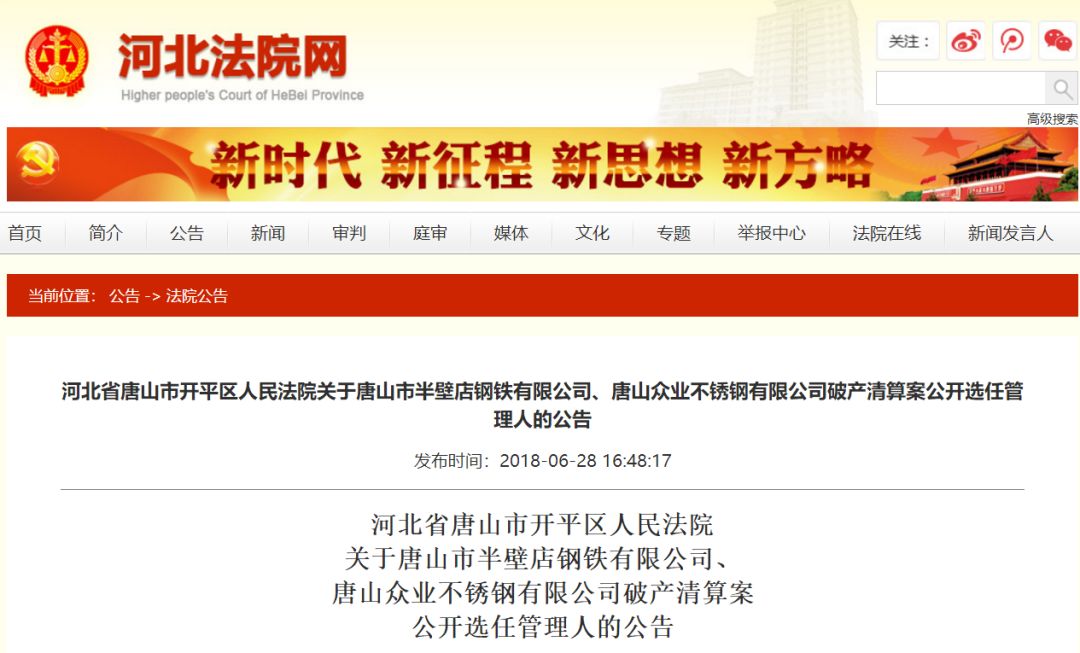 2018年6月,河北法院網公開發布的一則公告顯示,唐山市半壁店鋼鐵有限公司、唐山眾業不銹鋼有限公司以公司虧損嚴重,不能清償到期債務,并且資產不足以清償全部債務為由河北省唐山市開平區人民法院(以下簡稱“開平區人民法院”)提出破產清算申請。根據有關規定,開平區人民法院決定公開選任管理人。