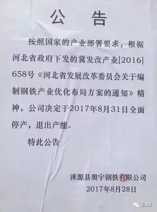 河北省淶源縣奧宇鋼鐵有限公司于2017年8月31日全面停產,退出產能,2000多名員工遣散,保定市成“無鋼之城”。